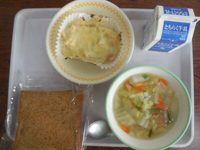 <今日の給食は、調理員さん一押しメニューの「マカロニグラタン」です。調理員さんと栄養士さんの愛情いっぱいのおいしいグラタンでした>