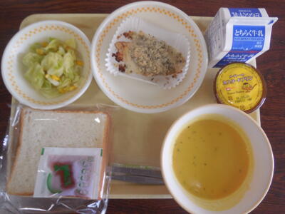 <今日の献立は、食パン、とちあいかジャム、カレイの香草パン粉焼き、キャベツとコーンのソテー、カボチャのポタージュ、プリン、牛乳です>
