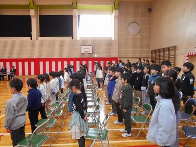 5時間目に、4,5年生が体育館の式場を整えたり、清掃したりしてきれいにしてくれました。また、6年生の教室や昇降口や靴箱に、素敵なお祝いの装飾をしてくれました。会場の準備がすっかり整いました。明日は、いよいよ卒業式。みんなで11名の卒業をお祝いします。