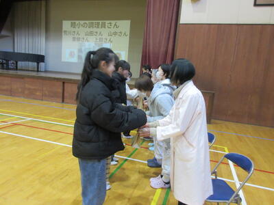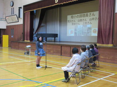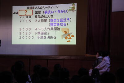 委員会児童が調理員さんの出勤時間をクイズに出すと、