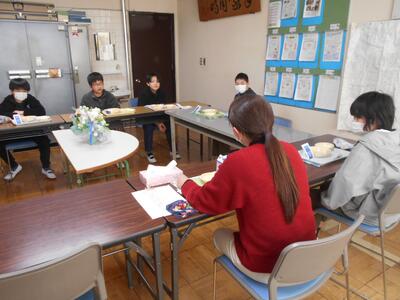 初めは慣れない校長室に緊張している様子でしたが、「小学校での一番の思い出」や「中学校で頑張りたいこと」、「将来の夢」などを話すうちに、和やかな雰囲気になってきました。どのグループも笑顔があふれ、思い出がまたひとつ増えました。