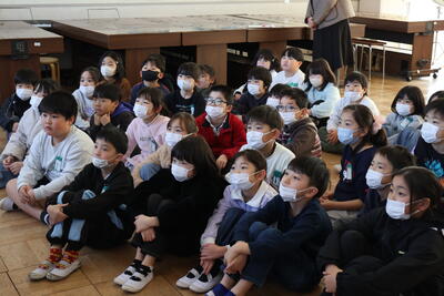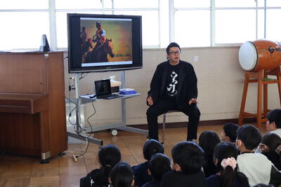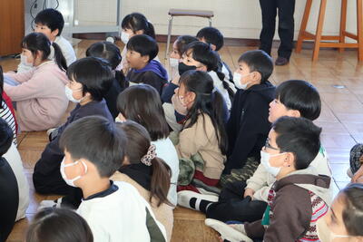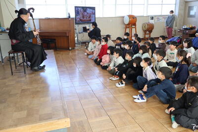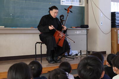 2年生の国語の教科書に掲載されている「スーホの白い馬」で登場する『馬頭琴』という楽器が登場すると、「お~~」と歓声が上がりました。馬の鳴き声や走る音の表現に、目をキラキラさせながら聴き入っていました。