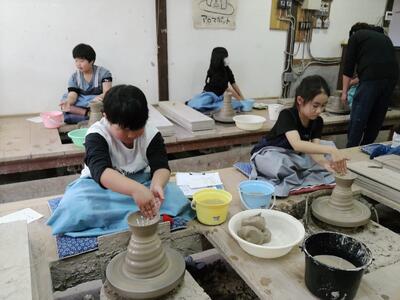 説明を聞いて作ってみますが、事前に考えていた形を作るのが難しくて四苦八苦の子供たち。益子焼の先生がそばについてくださり、丁寧に教えてくださいました。