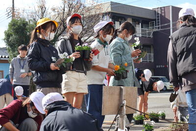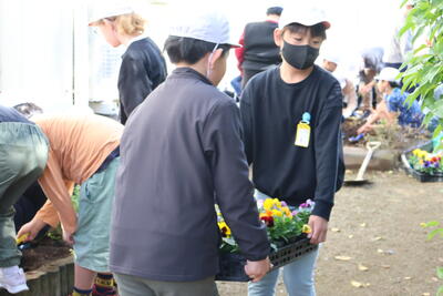まずは花壇の整備。腐葉土を入れて土をならしたり、花を運んだり。みんなで協力して行いました。
