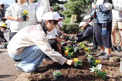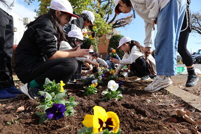 6時間目の委員会活動では、緑化・エコ委員会が、パンジーとビオラ、そしてチューリップの球根を植える活動を行いました。