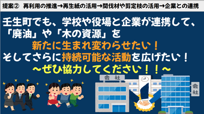 5年生は昨年の先輩たちの実践を引き継ぎ、ペットボトルの回収・廃油の回収によるリサイクルに加え、壬生町にもLRTを通そう、そして企業同士が連携して循環する町づくりをしていきたいと提案しました。