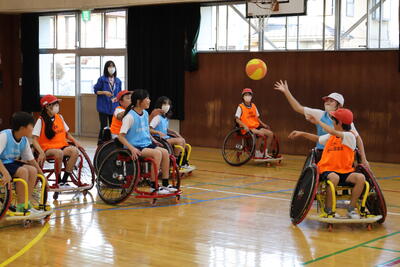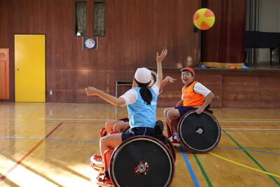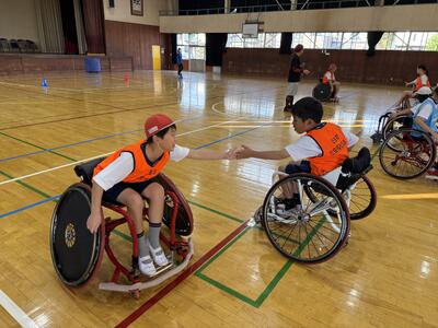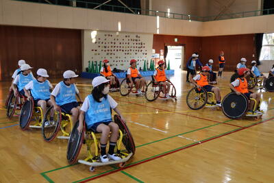 体育館では、競技用車いすを使った実技体験を行いました。最初は思うように動けず苦労する姿も見られましたが、徐々に操作に慣れ、友達と声をかけ合いながら積極的に車椅子バスケットボールに挑戦する姿が広がっていきました。実際に動かしてみたからこそわかる難しさやおもしろさに、子どもたちの表情もどんどん明るくなっていきました。