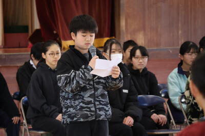 僕は、この6年間で一番成長できたのは6年生のときだと思います。最上級生として、いろいろなことに挑戦する機会があったからです。一方で、やって後悔するよりも、やらなくて後悔することが多い一年間でもありました。簡単に言えば新たな一歩を踏み出せないことが多かったということです。例えば、道徳の時間で発表出来るのにやらなかったり、自分は〇〇だからだめだなと思いやらなかったりすることがありました。しかし、その経験から得られたものもありました。それは、1回1回、与えられた立場に対して全力を尽くすことの大切さが分かったということです。だから反省を生かし、次からはまずは何事も挑戦してみようと思えるようになりました。そう思えるようになったのは、自分で成長した部分だと思います。前まではやりたくなかった放送に挑戦してみて、全て上手くいったわけではないけれど、やった甲斐があってよかったし、新たな一歩を踏み出せた気がしました。1〜5年生の在校生の皆さん、新たな一歩を踏み出せるチャンスは一度切りかもしれません。そしてそれを逃して後悔するよりも、それをしてみて後悔する方がいいですよね。皆さんの前に新たな一歩を踏み出せるチャンスが来たらぜひ、挑戦してみて後悔の無いように頑張って下さい。
