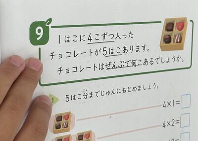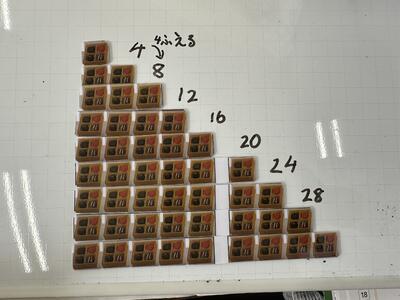帰り際に子どもたちに聞いてみると「4の段は4ずつふ増える」「3の段は3ずつ増える」「じゃあ、9の段もあるのかな?」「9の段は、きっと9ずつ増えるよ」と考えが広がっていました。この分かったことから次のことへと発展的に考えることができるのが『数学的な見方・考え方』です。何気ない会話から自然とそれを行う子どもたちに感心しました。算数って面白い!!