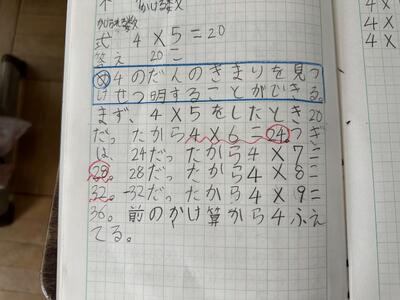 全員で問題を声に出して読みながら、大切なところに下線を引いて・・・2つのことを同時に出来るようになっていました。あっという間に式を立てて答えにたどり着いてしまいます。でも、ここからが今日の授業、『4の段のきまりを見付けて説明できる』ことがめあてです。子供たちは自分の考えをノートに書き始めました。