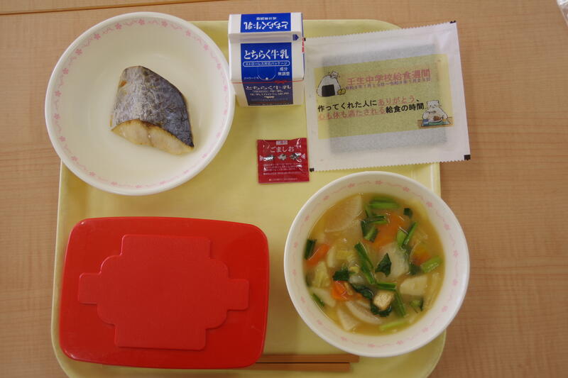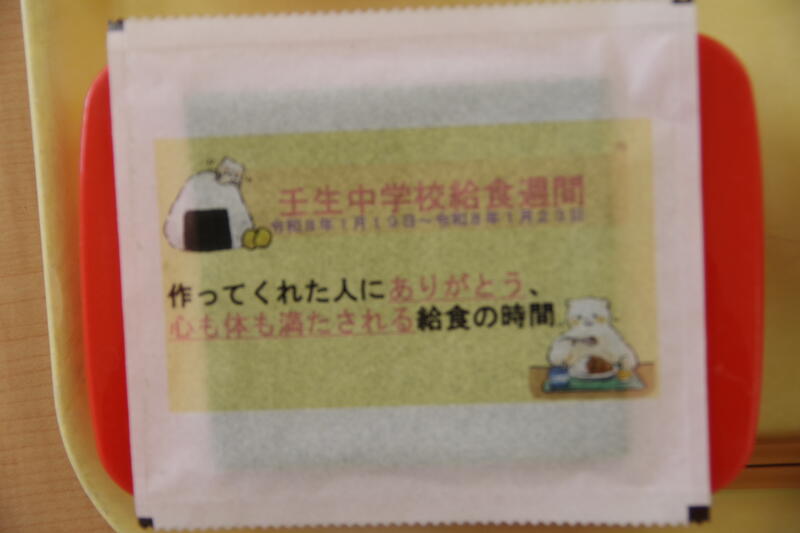 作ってくれた人のありがとう~心も体も満たされる給食の時間。手巻きのりのパッケージは2年1組の山本月渚さんのオリジナルデザインです。給食週間最終日の23日(金)には、大きめのさわらの塩焼きが提供されました。魚へんに春と書いて鰆(さわら)。寒い日が続きますが春はもうすぐです。
