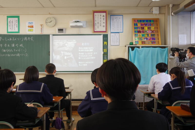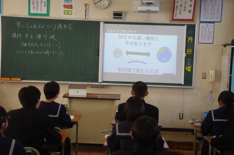 21日(金)町教育委員会主催で夢と志のある人づくり講演会が開催されました。今回の講師は株式会社タカラトミーメディア戦略室部長兼SORAーQプロジェクトリーダー赤木謙介さんでした。月面に着陸し、撮影活動ロボット、SORA-Qの開発秘話を詳細に話してくださいました。おもちゃ作りの技術が大いに生かされているそうです。「今やっていることは後々きっと何かの役に立つ。ぜひ、好きなこと、得意なことを伸ばしていってほしい。」そんなメッセージが生徒の皆さんに届けられました。