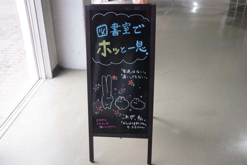 図書室でホッと一息 投稿日時 : 11:39 壬生中学校管理者 カテゴリ: 昇降口前廊下に素敵な看板が置いてあります。生徒の作品です。テスト期間中なので、読書の時間を確保するのは難しいと思います。しかし、忙しいときに限って、無性に本を読みたくなることもあります。人の心は気まぐれなものです。そんな時は、ぜひ図書室を。