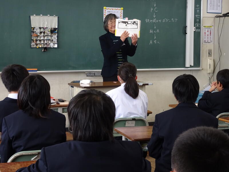 読書週間です。 投稿日時 : 11/10 壬生中学校管理者 カテゴリ: 読書の秋~10日(月)から壬生中学校読書週間が始まりました。本を開けば、そこは君だけの新しい世界。読書で心の冒険の旅に出かけましょう! <10日、11日は12年生にボランティアの方が読み聞かせをしてくださいました>