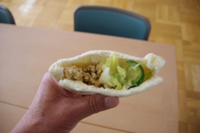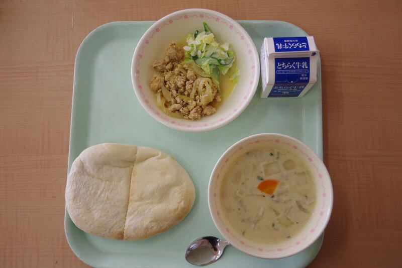 4日の給食のメニューはケバブサンド ピタパン 豆乳とジャガイモのクリームスープ、牛乳でした。給食委員会の皆さんの考案です。エスニックな味を楽しめました。クリームスープもとてもおいしかったです。温まりました!