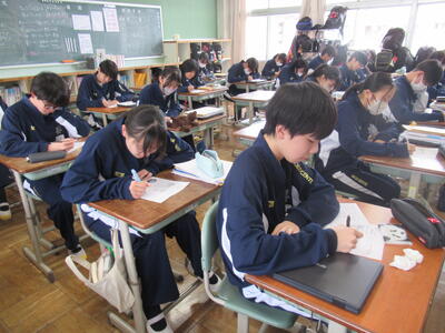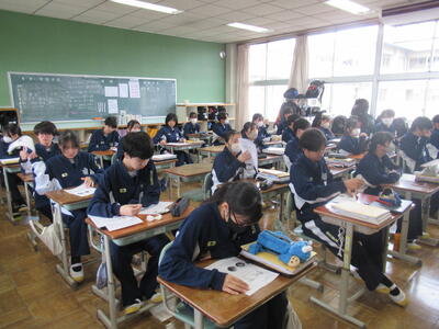 3月16日(月)1校時、2年5組の社会科の授業を参観しました。今日の学習内容は、歴史と地理の入試問題です。歴史の問題は、東京都のある私立中学の入試問題です。中学入試問題ですから、小学校6年生用の問題です。とは言え、内容はなかなか難しく、2年5組の生徒も大変苦労していました。また、地理の問題は、過去の栃木県立高校入試で出題された基本問題です。この一年間を振り返り、基礎や応用問題をたくさんチャレンジすることで、確かな学力の定着に努めてほしいと思います。