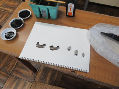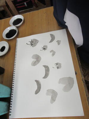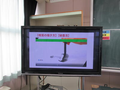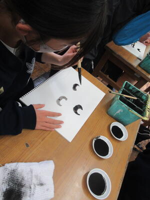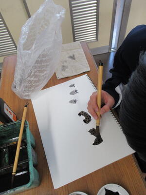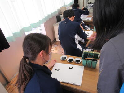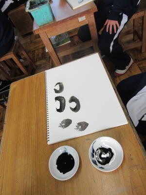 1年1組 美術「水墨画」 投稿日時 : 12/02 南犬飼中学校管理者 カテゴリ: 12月2日(火)6校時、1年1組美術の授業を参観しました。学習内容は「水墨画」です。濃い色、普通の色、薄い色の描き方を、水の量を調整しながら描いていました。普通の絵画と違い、描き慣れていないため、濃さの調整が非常に難しいようです。それでも、生徒たちは、水の量をうまく調整しながら、大小様々な円やイチゴ、シイタケなどの制作に集中していました。 教師のアドバイスを聞いています。 {{options.likeCount}} {{options.likeCount}}
