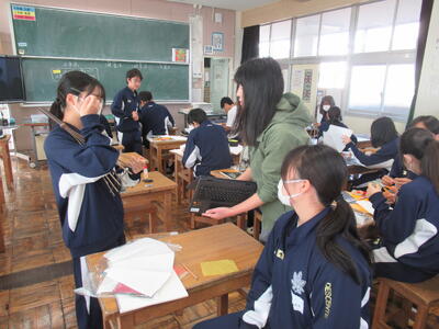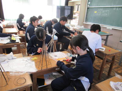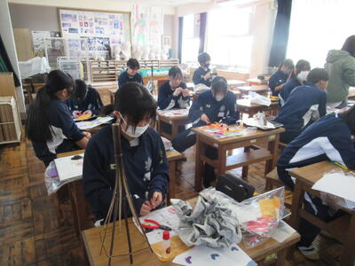 2年1組「美術」~和製ランプの製作~ 投稿日時 : 11:41 南犬飼中学校管理者 カテゴリ: 11月8日(金)1校時、2年1組の美術を参観しました。和製ランプを製作していますが、今日が製作最終日になっています。すでに完成している生徒もいましたが、デザインに凝り過ぎてしまい、計画通りに進まない生徒もいるようです。デザインは生徒独自のもので、とてもバラエティーに富んでいるように思いました。素敵な和製ランプの完成がたのしみですね! {{options.likeCount}} {{options.likeCount}}