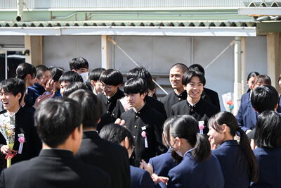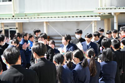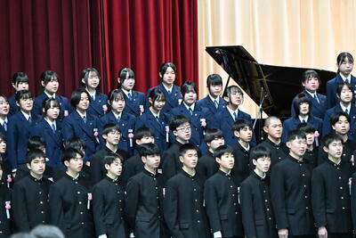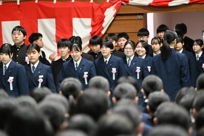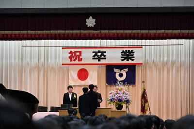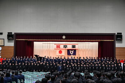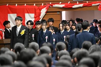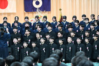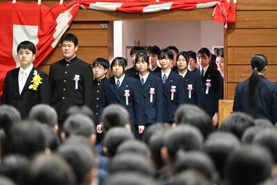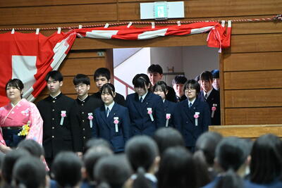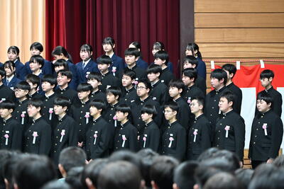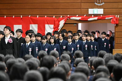 3月7日(土)、壬生町議会議員の皆様、学校運営協議会委員の皆様、PTA本部役員の皆様、そして保護者の皆様のご臨席のもと、第79回卒業証書授与式が盛大に行われました。厳粛な雰囲気の中、3年生171名の生徒が立派に卒業証書を授与されました。卒業生への餞の言葉として、「艱難、汝を玉にす」(かんなん、なんじをたまにす)という言葉を送りました。。あまり、聞きなれない言葉かもしれませんが、意味は「多くの困難や苦労を乗り越えて、はじめて立派な人物になれる」という意味です。今、国の内外を問わず、多くの課題が山積しています。これから巣立っていく卒業生の皆さんの前途はけっして順風満帆というわけにはいきません。大きな壁が立ちはだかることがあるかもしれません。そのような困難や壁が立ちはだかったときこそ、人と人との「絆」が大切です。「人」そのものが互いに支え合うことで人という字は成り立っています。人の心を思いやる力、人の痛みを感じ取る力、人の命を大切にする力。そんな力を身に付け、厳しい現実と向き合っていってほしいと思います。