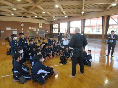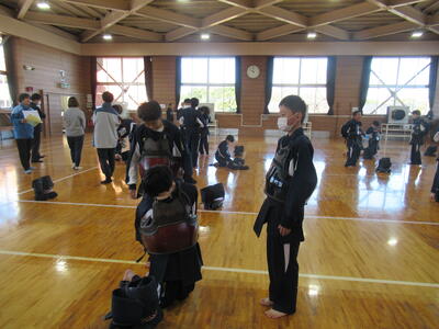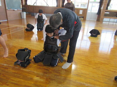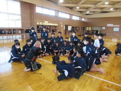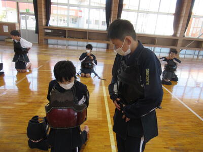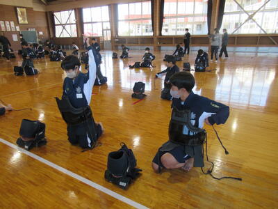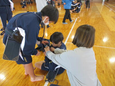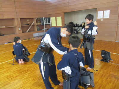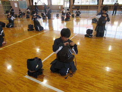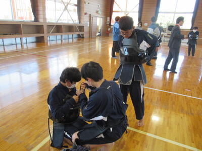 11月12日(水)2校時、1年3,4組男子保健体育「剣道」を参観しました。今日の学習内容は、剣道の防具を正しく着装することです。具体的には、剣道の垂れと胴を着けるわけですが、ほとんどの生徒が初めての経験ということもあり、なかなかうまく着装できません。まずは、担当教諭から垂れと胴の詳しい説明があり、生徒は、真剣な眼差しで説明を聞いていました。いざ着装となると、上手くいかないのが難しいところです。生徒は、近くの友達に相談したり、担当教師に手伝ってもらったり、またある生徒は参観している先生方に手伝ってもらったりして、何とか着装までたどり着きました。何事も慣れが大切ですので、今後の授業では、目標にある2分以内の着装ができるといいですね!
