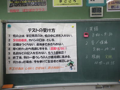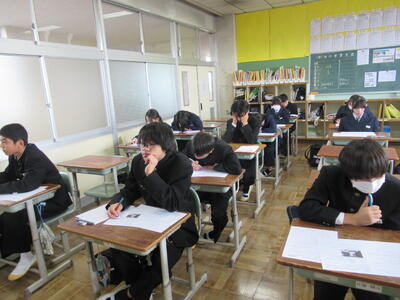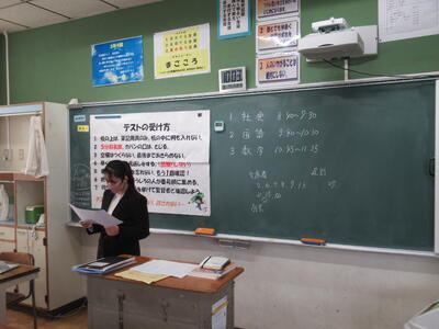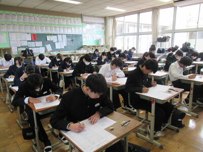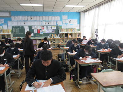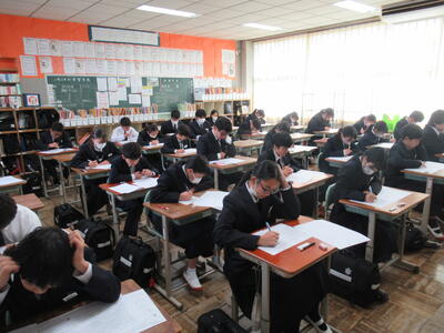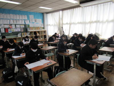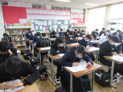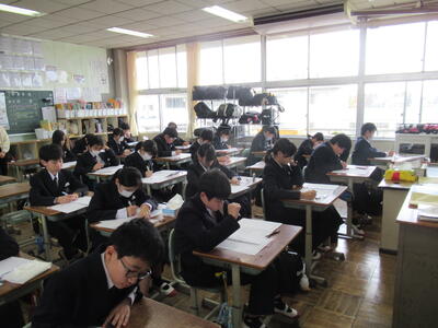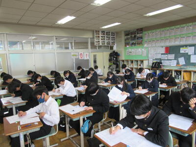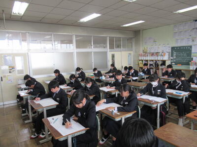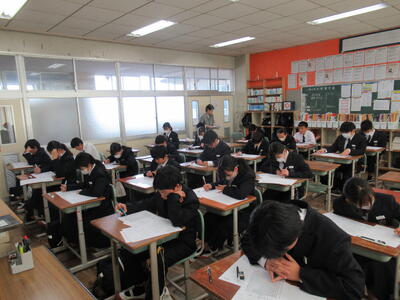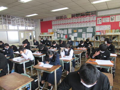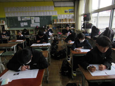 2学期期末テスト2日目。今日のテストは、1年生が(理科、数学、社会)、2年生が(英語、音楽・保体、理科)、3年生が(理科、音楽・保体、数学)です。2学期最後の締めくくりのテストです。犬中生の健闘を期待します!