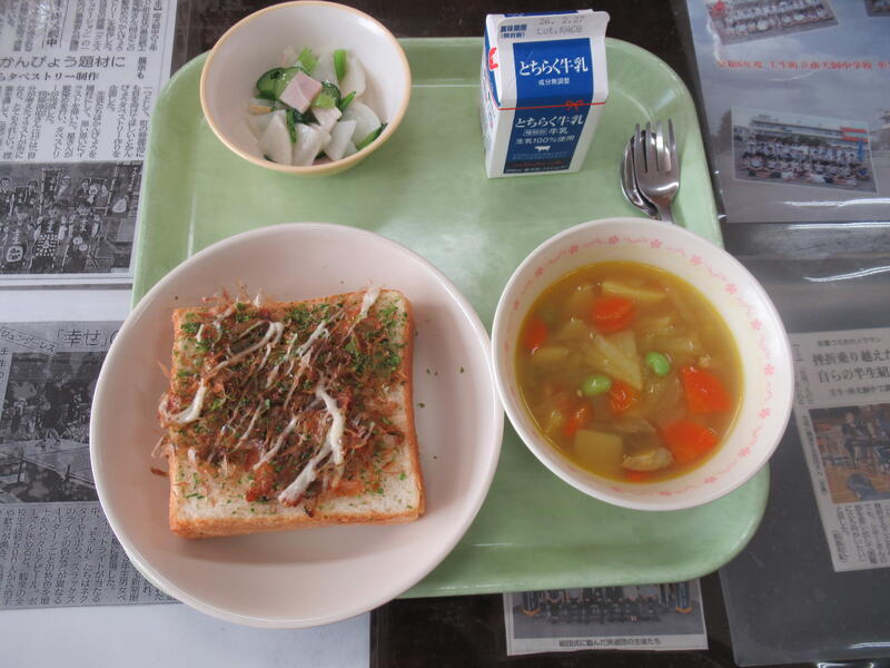 2月16日(月)、今日の給食のメニューは「満腹満足!お好み焼き風トースト、鶏肉とじゃがいもカレー煮、かぶとハムのサラダ、牛乳」です。このメニューは、2年生の夏休みの課題で出された「オリジナルトーストを作ろう!」のレシピの中の一つです。10月から2月にかけて計5回実施した最終回の第5弾、オリジナルレシピのメニューです。生徒が考えたアイデア満載、栄養満点の給食はいかがですか?食べる前からお好み焼きの匂いが食欲をそそり、生徒たちがとても喜ぶ一品ですね!