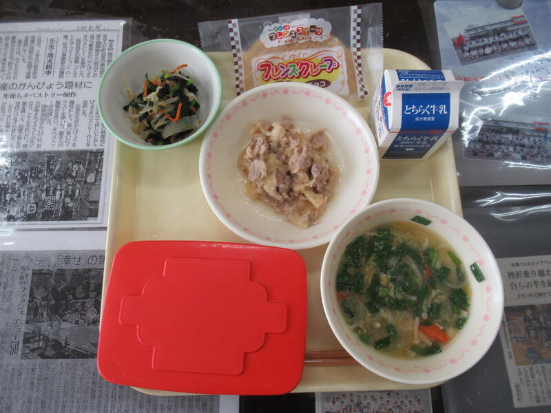 3年生リクエスト給食 投稿日時 : 13:05 南犬飼中学校管理者 カテゴリ: 2月20日(金)、今日の給食のメニューは「ごはん、牛乳、おろぽんちー、ほうれん草とこんにゃくの磯辺和え、坦々みそ汁、クレープ(チョコ)」です。このメニューは、3年生(3年5組)がリクエスト給食として、12月に考えたオリジナルレシピのメニューです。3年生のアイデア満載、栄養満点の給食はいかがでしたか?見るからにとても美味しそうですね。3年生の皆さん、ご馳走様です! {{options.likeCount}} {{options.likeCount}}