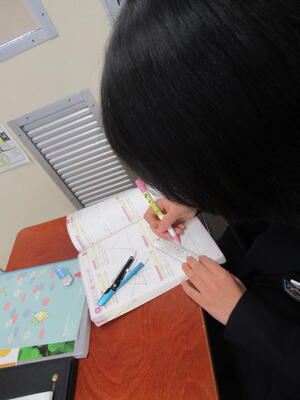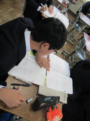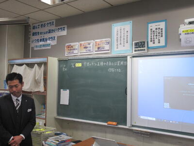 12月24日(水)2校時、1年4組数学の授業を参観しました。今日の学習は、空間図形の単元で、空間の中での直線や平面の位置関係の内容です。空間の中での平行や垂直は、平面における平行や垂直とは違い、3次元で考えるわけですので、実際のイメージを働かせて考える必要があります。空間図形が苦手な生徒は実際に模型を活用しながら学習することも大切です。式の計算のように、問題を解く公式のようなものがあるわけではないので、一つ一つ丁寧に問題を解きながら、イメージを膨らませていくとよいですね。
