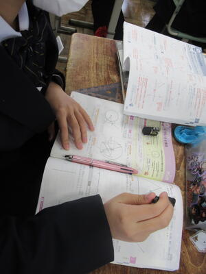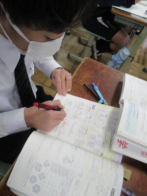 12月19日(金)5校時、1年2組数学の授業を参観しました。「空間図形」というの単元で、正多面体を学習していました。多面体とは、「合同な多角形で囲まれ、どの頂点にも同じ数の面が集まっている凸多面体のことです。ちなみに、正多面体は5種類(正四面体、正六面体、正八面体、正十二面体、正二十面体)しかありません。