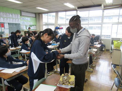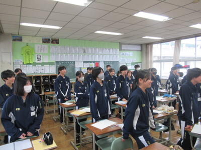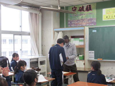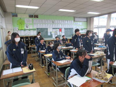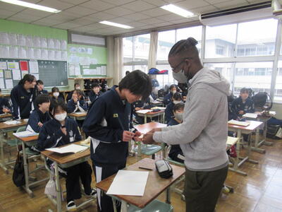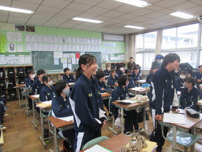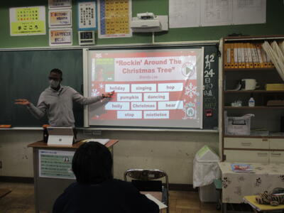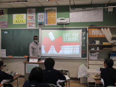 12月24日(水)4校時、2年5組の英語の授業を参観しました。今日はクリスマスイブということもあり、英語の授業では、クリスマスにちなんだ歌に関するクイズで大盛り上がりでした。黒板に映し出された10個のワードがあります。ただし、その中の1つは歌の中の歌詞に出てこないワードです。そのワードを予想するという問題です。クイズの名前は、「LAST ONE  STANDING」(最後まで立って残るのは誰?)です。歌の中に出てくる歌詞は、様々な背景から生まれる言葉ですから、そう簡単に当てられるものではありません。それでも、33名のクラスの中から1~3名ほどの生徒が正解しました。ズバリ当てた生徒には、ALTの先生から嬉しいプレゼントがありました。何とも微笑ましいですね!