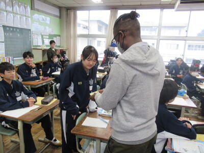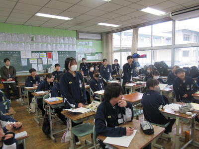 12月10日(水)1校時、2年2組の英語の授業を参観しました。今日の授業は、壬生町教育委員会による教科指導訪問を兼ねておりましたが、生徒は普段通り生き生きと取り組んでいました。学習内容は、トビウオの特徴や情報についての英文を読み取り、要点をまとめることです。授業の初めに、本文の内容が想起しやすいように、動画を視聴したり、進出単語やキーセンテンスをしっかり押さえることで、学習の中心となる本文読解にスムーズに移行できました。何度も何度も本文を読むここで、分からない単語や文法を予測し、英文全体の意味を理解していくことは、英語ならではの学習法です。最終的に、ほとんどの生徒が、トビウオについての特徴を読み取ることができました。