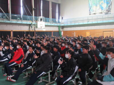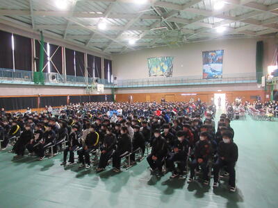 1月19日(月)、第2学年生徒、保護者、関係職員が参列し、立志式を行いました。立志式実行委員長あいさつ、校長式辞、県知事からのお祝いのメッセ―ジ、立志記念品の贈呈、代表生徒による作文発表、全生徒による誓いの言葉、記念合唱など盛りだくさんの内容でした。特に、全生徒による誓いの言葉は、一人一人の思いを漢字一文字に表し、それぞれの立式に向けた誓いを生の声で堂々と発表する姿に感動しました。また、2年生全生徒で歌った記念合唱「超えてゆけ」では、素敵な歌詞と素敵なメロディーが体育館いっぱいに広がり、2学年全員の迫力ある歌声で、聴いていた保護者や職員にしっかりと想いを届けました。そして、2学年生徒にサプライズ企画として披露した生まれたときから、これまでの生い立ちをまとめた写真のスライドショーでは、懐かしい写真と共に添えられた暖かいメッセージに、感動の涙が自然とあふれる場面が多くあり、参列した方々の感動を呼びました。スライドショーの中に、親からのメッセージに添えられた「元気に生まれてきてくれて、ありがとう」の言葉に、自然と涙を拭いている保護者がとても印象的でした。