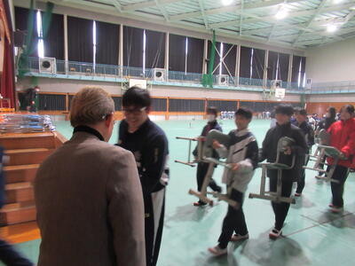 11月12日(水)2校時、1年3,4組男子保健体育「剣道」を参観しました。今日の学習内容は、剣道の防具を正しく着装することです。具体的には、剣道の垂れと胴を着けるわけですが、ほとんどの生徒が初めての経験ということもあり、なかなかうまく着装できません。まずは、担当教諭から垂れと胴の詳しい説明があり、生徒は、真剣な眼差しで説明を聞いていました。いざ着装となると、上手くいかないのが難しいところです。生徒は、近くの友達に相談したり、担当教師に手伝ってもらったり、またある生徒は参観している先生方に手伝ってもらったりして、何とか着装までたどり着きました。何事も慣れが大切ですので、今後の授業では、目標にある2分以内の着装ができるといいですね!