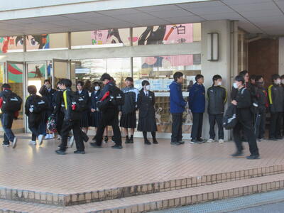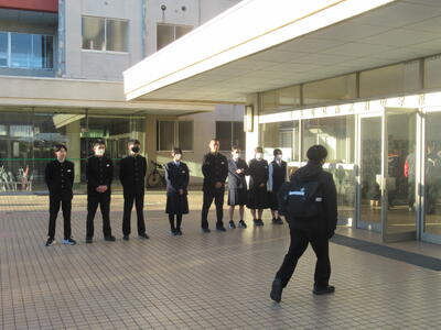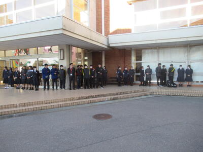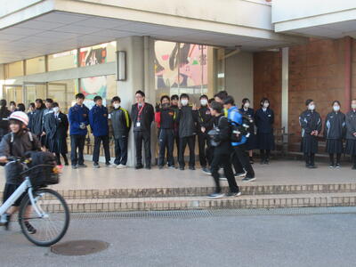 1月14日(水)早朝、昇降口前から、爽やかな明るい挨拶が聞こえてきました。生徒会が企画した「犬中あいさつの日プロジェクト」です。今日の担当は生徒会役員と、学習委員です。「あいさつの意識を高め、あいさつが溢れる南犬飼中学校にすることで、活気のある校風を創り上げていく」、「生徒自らあいさつ運動に参加することで、物事に主体性をもって取り組む力を養う」ことを目的に、生徒会が主体となって企画したものです。年間を通して月に2回ずつ実施していますが、各委員会での活動にして生徒全員が参加できるようにしたことが大きな特徴です。今回も朝から生き生きとした声が響き渡り、とても気持ちよく1日のスタートがきれたように感じます。