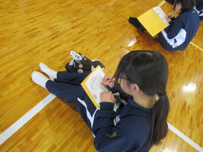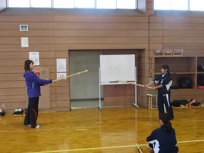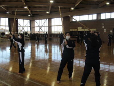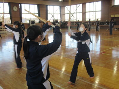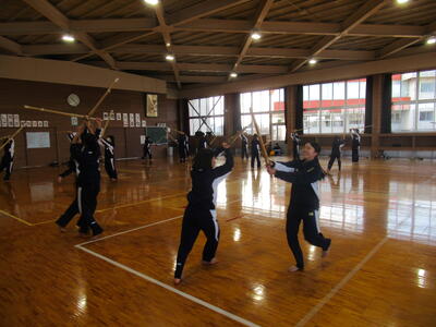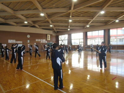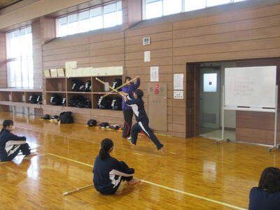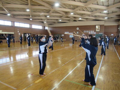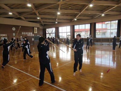 1月28日(水)2校時、1年3,4組女子保健体育を参観しました。授業内容は「剣道」です。剣道と言えば、日本を代表する武道ですので、生徒にとっても何か特別な想いがあるのではないでしょうか。今日の学習内容は、竹刀をもった「メン打ち」の練習です。授業の最初に、教師から有効打突について細かな指導があり、生徒一人一人が気合を入れて「メン打ち」に取り組んでいました。1月下旬はとても寒く、裸足で立っているだけでもとても大変なことです。幸いなことに、本校剣道場は冷暖房設備が完備されており、生徒は気合の入った大きな声を出しながら、気持ちよく取り組んでいました。
