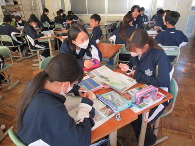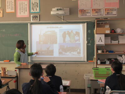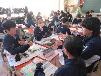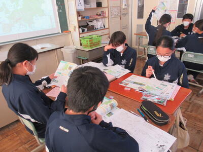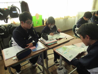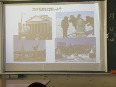 11月20日(木)5校時、1年1組の社会の授業を参観しました。今日の学習内容は、ヨーロッパの気候についてです。授業の導入場面で、4枚の写真を見せました。どこの国の写真なのかを予想します。答えは、イタリア(パルテノン神殿)、モンゴル(冬の草原)、フランス(パリにあるエッフェル塔)、日本(札幌の時計台)の写真でした。当てた生徒は大喜びです。次の質問「では、これらの写真に共通するものは?」という発問に、生徒は四苦八苦していました。答えは「緯度がほぼ一緒」ということです。次の質問「緯度がほぼ一緒なのに気候に違いがあるのか」という質問。こうして本題の「ヨーロッパの気候」に視点を当てさせてから学習内容に入っていきました。興味・関心を高めて学習すると効果抜群ですね!