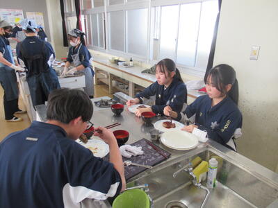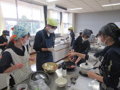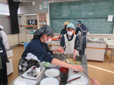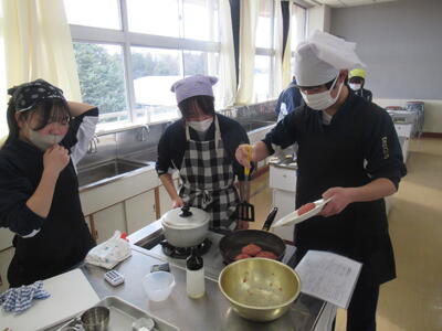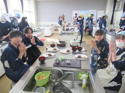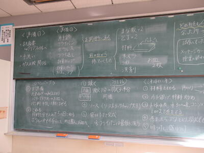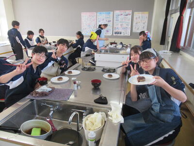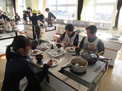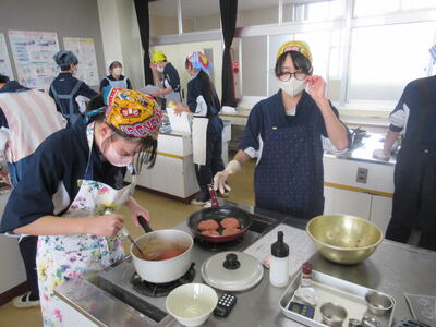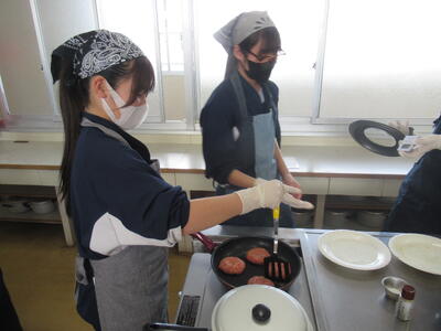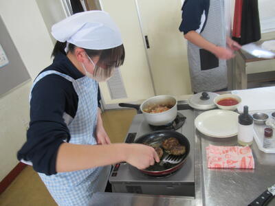 1月29日(木)5,6校時、2年5組家庭科の授業を参観しました。学習内容は調理実習です。メニューはハンバーグとミネストローネです。授業の初めに、教師から調理実習についての細かな指示がありました。ハンバーグにおいては、下準備、こね方、焼き方、ソースづくり、盛り付けなどです。3~4人のグループで、どの班も男女が協力して、楽しそうに取り組んでいました。最後に生徒たちは試食していましたが、どの班も上手にできたようで、とても美味しそうに食べていました。