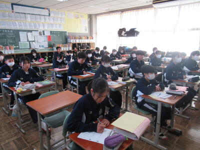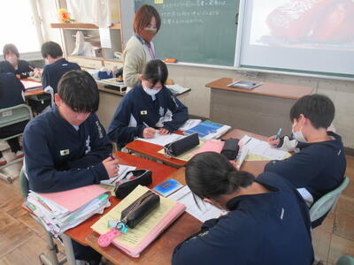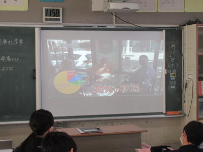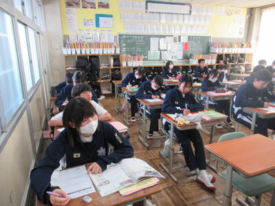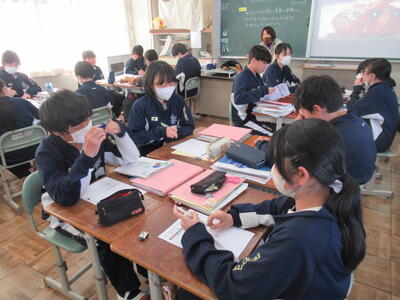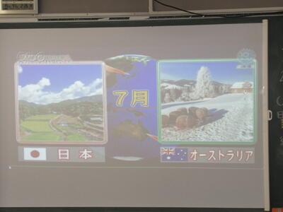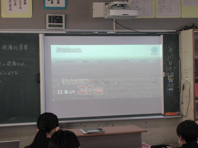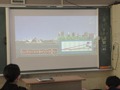 2月26日(木)4校時、1年3組の社会を参観しました。今日の学習は、オセアニア州の国々の産業の発展についてです。オセアニアと言えば、まず、オーストラリアが思い浮かびます。今日の学習でも、オーストラリアについて、映像で説明がありました。人口は日本の約5分の1ですが、国土が日本の20倍ととても大きな国です。日本とは、経済的な結びつきが強く、貿易も非常に盛んです。日本と経度がほとんど変わらず、南半球に位置していますので、季節が日本と正反対というところに生徒は興味を示しているようです。昔は、白豪主義の影響もあり、白人の国のイメージですが、今は移民が総人口の3割を占め、国際色豊かな国となっており、経済が著しく成長しているのが、大きな特徴ですね。1年生の皆さん、オセアニア州の国々について、これから詳しく学んでください。