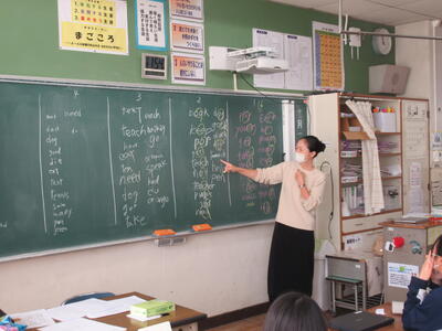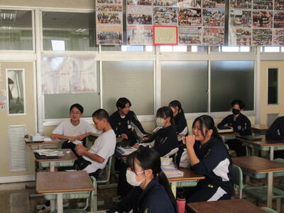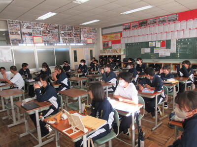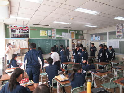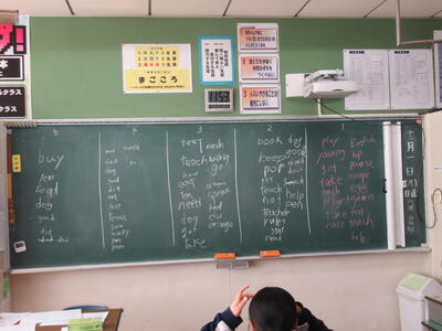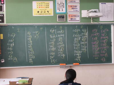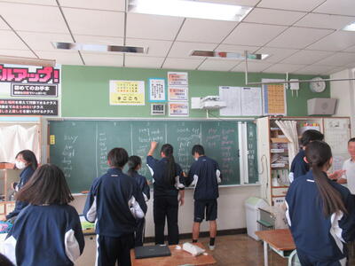12月1日(月)4校時、2年1組の英語の授業を参観しました。授業の導入で、班対抗の「しりとり英単語」を実施していました。各班で書く順番を決め、制限時間内でどれだけ多くの英単語を書けたかを班対抗で競うものです。授業では、ゲーム形式を取り入れることで、生徒の関心・意欲が向上させることがよくあります。今回の「しりとり英単語」でも、もちろん、盛り上がっていました。全員参加型なので、単語が苦手の生徒に対しても、班員がアドバイスを送るなど、協調性も培われます。できれば、最近習った新出英単語が多く出でくると、授業としても大成功ですね!